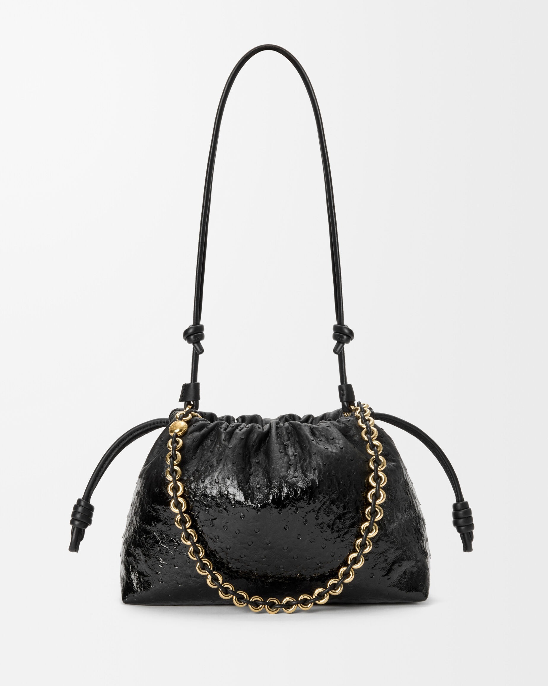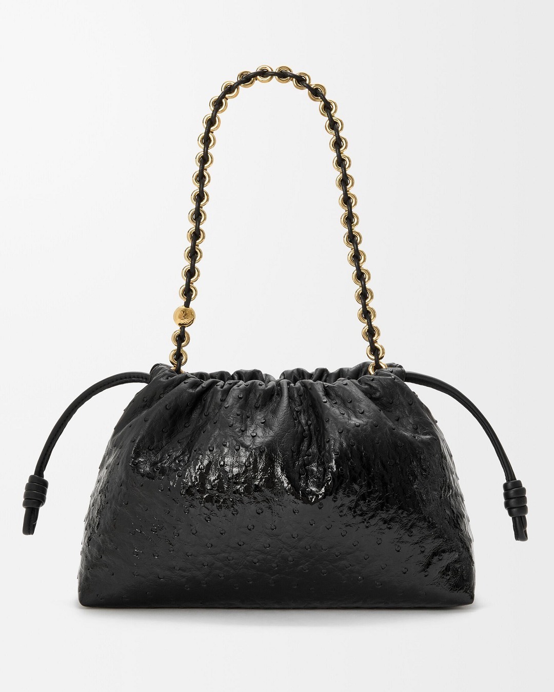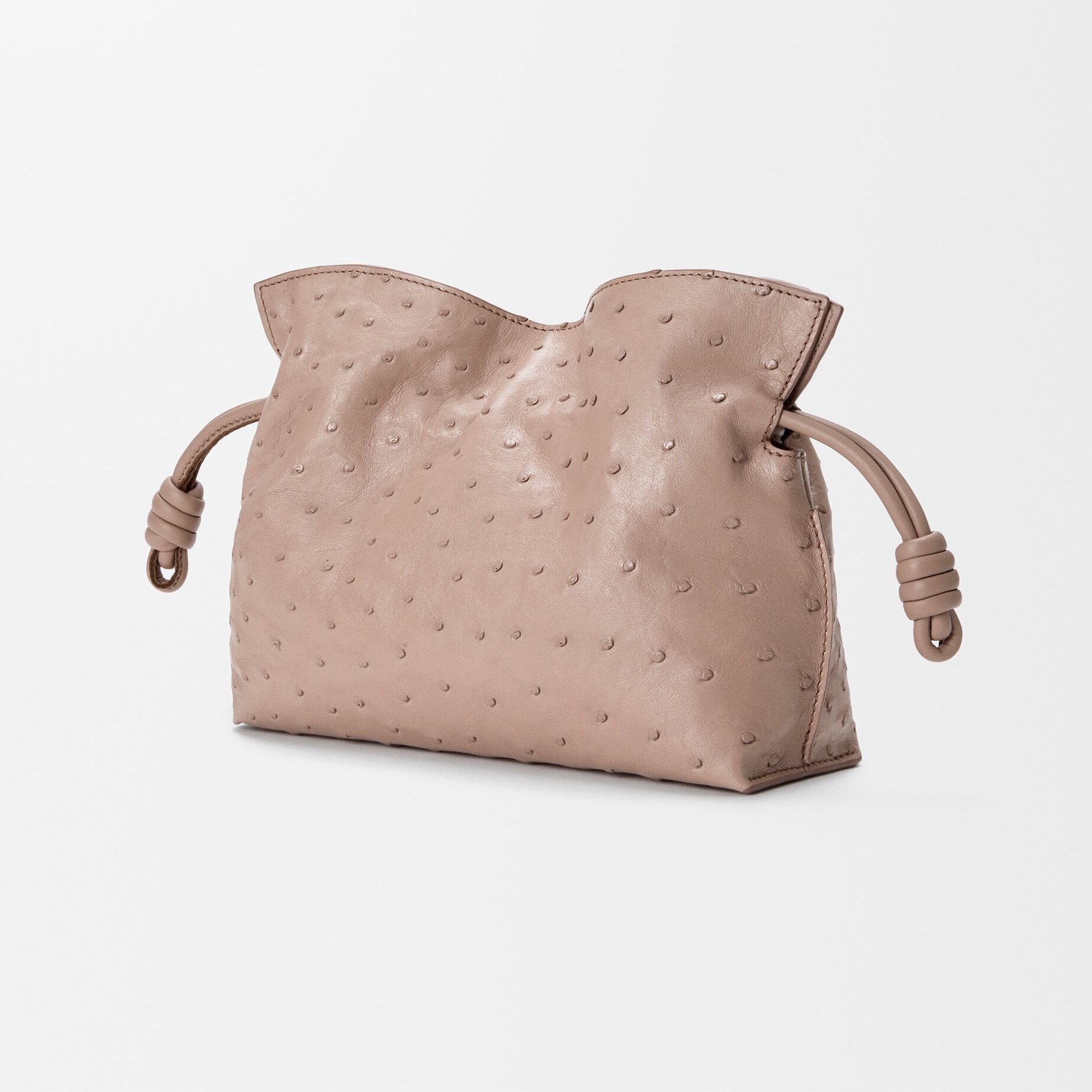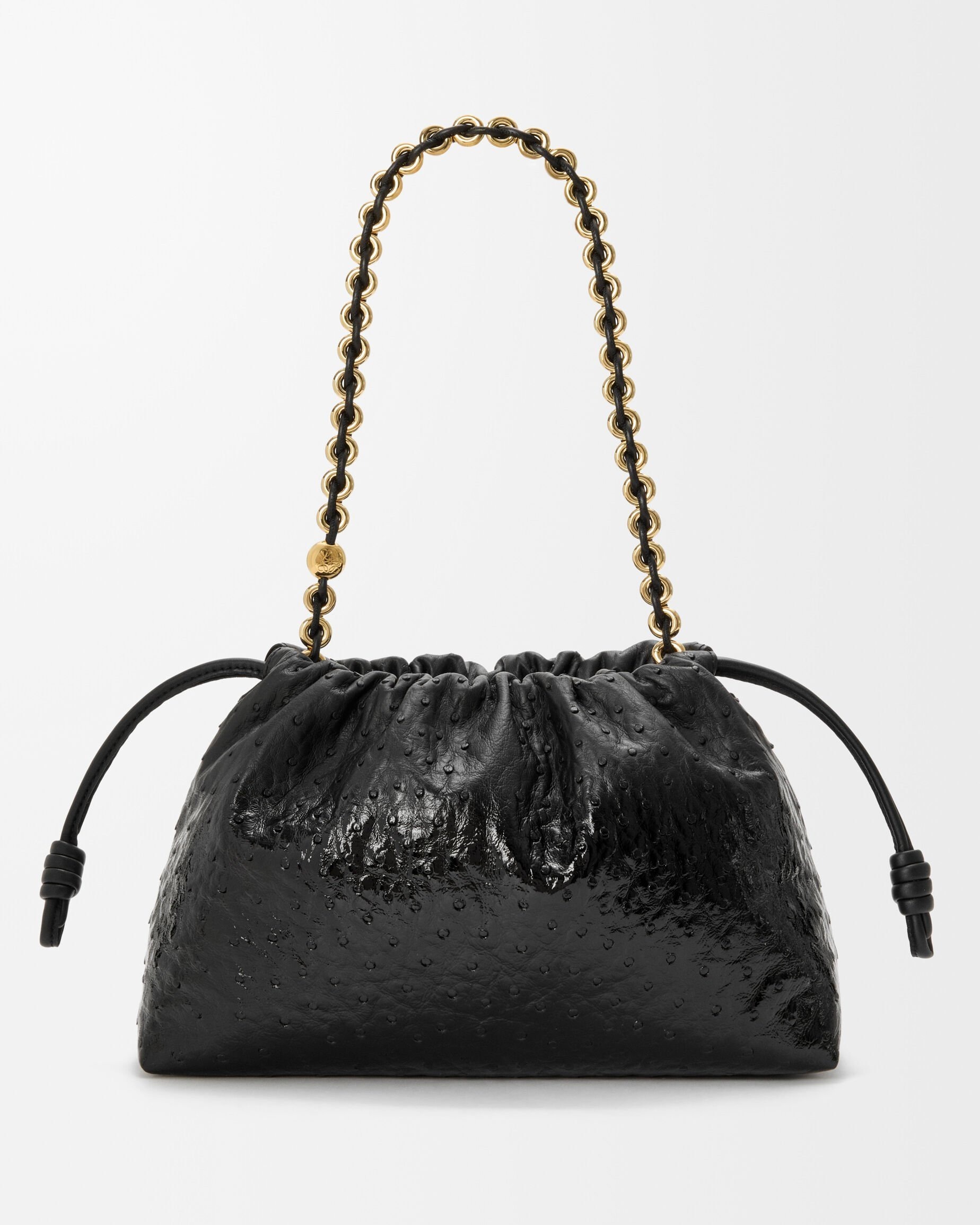 另一组采用鸵鸟皮演绎的是 Flamenco 手袋,柔韧轻盈的皮质塑造出慵懒的云朵廓形,搭配抽绳束口和盘绕结装饰。包包的设计灵感来自西班牙传统弗拉门戈舞(Flamenco),自然抽褶的廓形犹如舞者的浪漫裙摆。