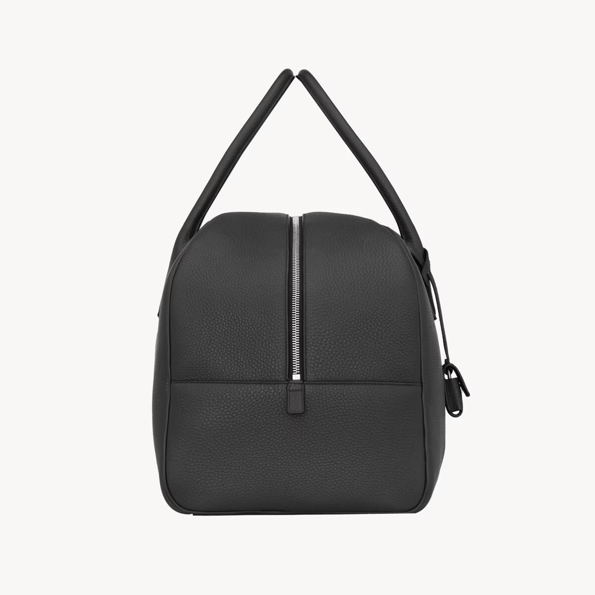 这款男士旅行包采用经典圆润的保龄球包型,「45x28x23cm」的中号规格提供宽敞充裕的容量空间,适合作为男士出差或旅行的包袋之选。这只取材厚实耐用的粒面皮革制作而成,黑灰色调显得深沉而内敛,一枚银色挂锁成为点睛。
