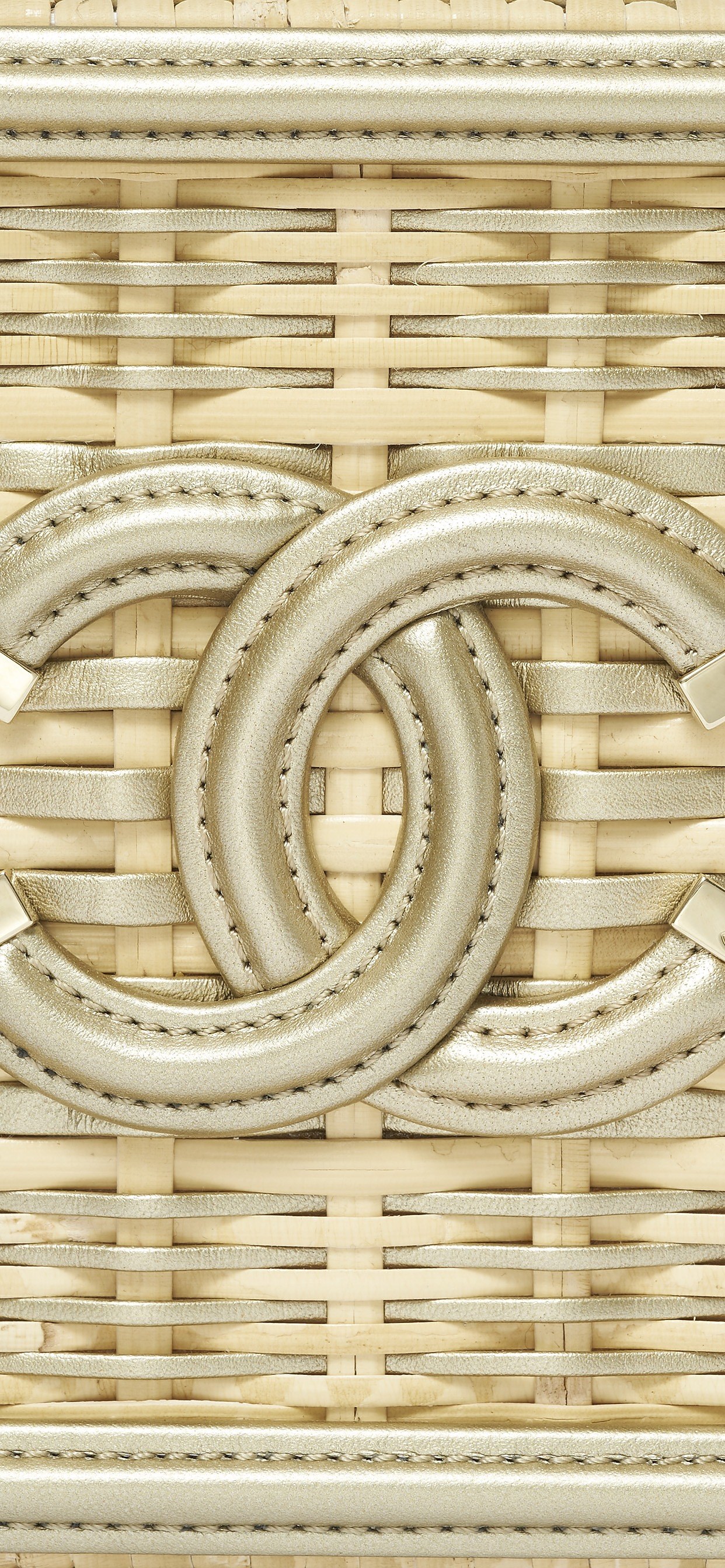 包包主体以藤条(Ratten)编织而成,采用经纬交错的编制手法,越靠近边缘的位置藤条分布越为细密。横向上间隔以原色藤条和浅金色小牛皮包覆的藤条交错呈现,质感精致且高级。