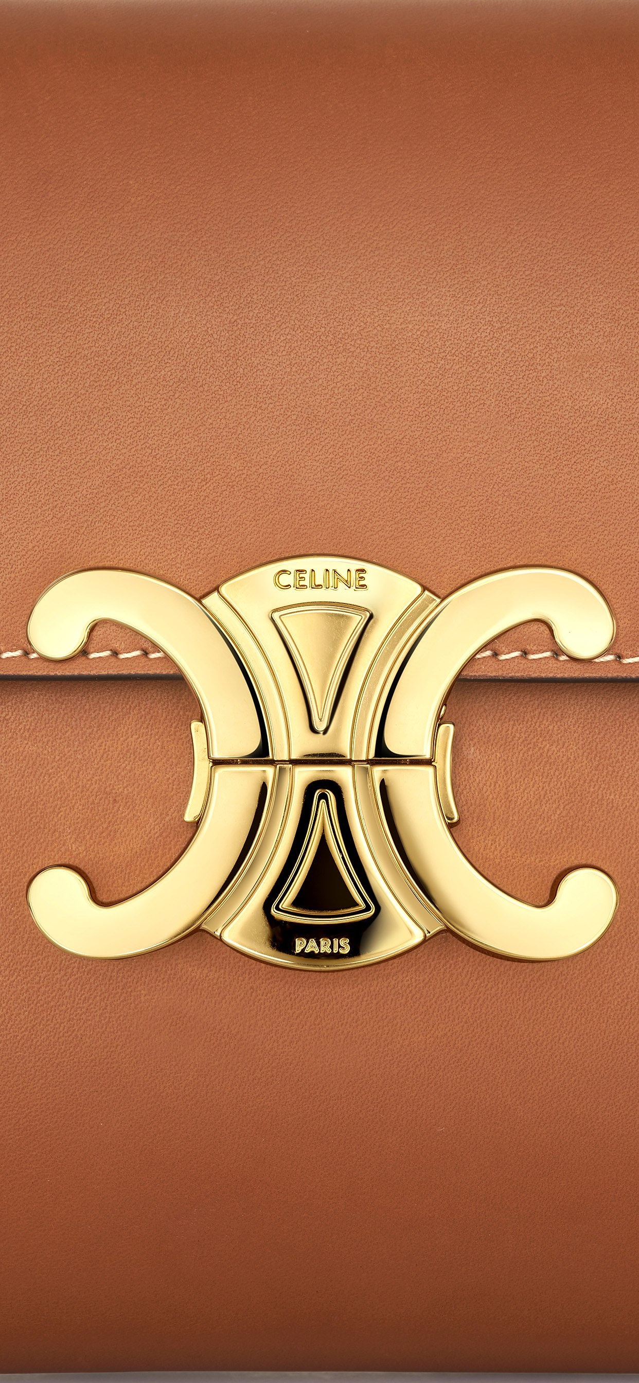 从2018年的 Triomphe 金属扣、反复运用于成衣印花的 Triomphe 锁链图腾,到2019年推出的 Triomphe 老花帆布,经过两年磨砺,这个来自70年代的凯旋标识已经成为新 CELINE 最具辨识度的设计元素之一。抛光闪亮的 Triomphe 搭扣是包身唯一的五金装饰,如同一枚封印信件的浮雕印章,为包包增添古典庄重气息。轻按两侧弹簧扣开启包盖,露出里衬上小小的 TRIOMPHE 烫印标签。