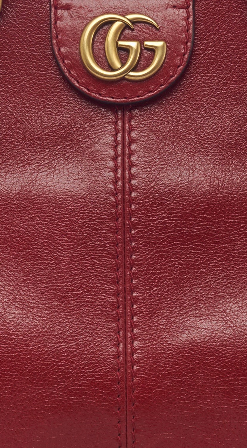 古铜色与酒红色永远是经典搭配,包身正面饰有「双G logo」,背面则是另一个 Gucci 标志元素——「狮头」,在罗马神话中象征野心与奢华。